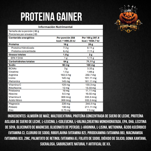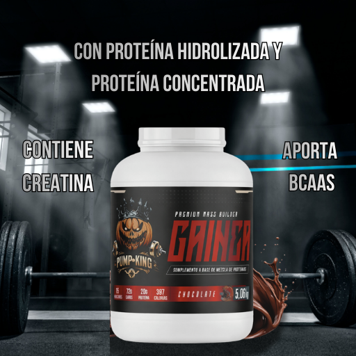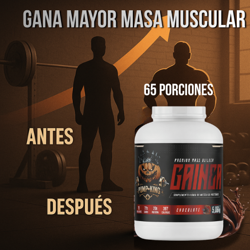 Gainer Mass Pump-King es la fórmula perfecta para quienes buscan aumentar masa muscular, peso y volumen corporal. Contiene una combinación precisa de carbohidratos complejos, proteínas de suero, vitaminas y minerales, que juntos aportan energía sostenida y un superávit calórico ideal para promover la hipertrofia.
