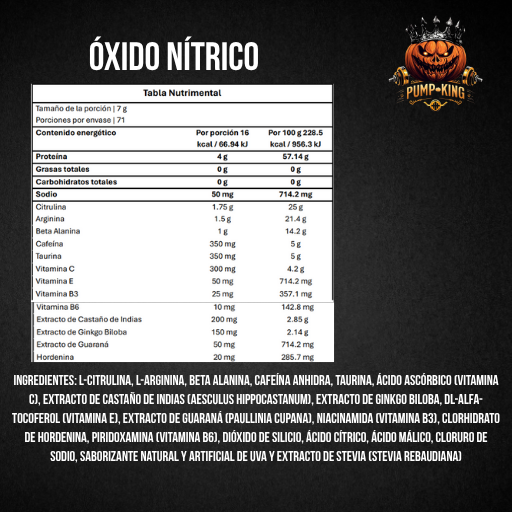 El Pre-Entreno Óxido Nítrico de Pump-King está diseñado para maximizar tu energía, concentración y flujo sanguíneo durante cada sesión. Su fórmula avanzada combina arginina, beta-alanina, cafeína natural y extractos vasodilatadores, que aumentan la oxigenación muscular, retrasan la fatiga y mejoran la congestión muscular.